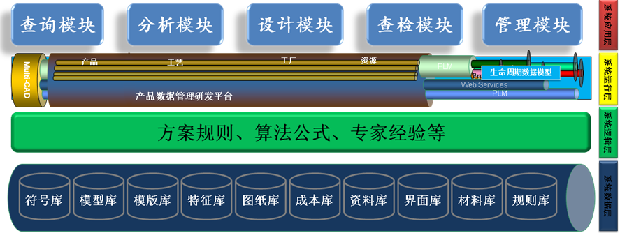 包裝智能設(shè)計(jì)APP主要包含選型、設(shè)計(jì)、檢查、分析、管理五大模塊,對(duì)應(yīng)了產(chǎn)品設(shè)計(jì)的全流程,可以服務(wù)于整個(gè)產(chǎn)品的研發(fā)過程,系統(tǒng)架構(gòu)如下圖所示: