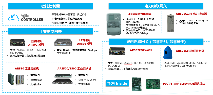 EC-IoT解決方案包括終端通信模塊(PLC-IoT/RF 6LowPan),邊緣計算網關(AR502系列產品),邊緣計算核心板(HiGrid T1和EC Core-L-1)和敏捷控制器(Agile Controller),其中終端通信模塊支撐終端層設備間的智能互聯,邊緣計算網關負責對這些設備進行智能管理,而敏捷控制器通過開放的API與合作伙伴們的行業應用系統進行對接,EC-IoT解決方案主要應對兩類業務場景: