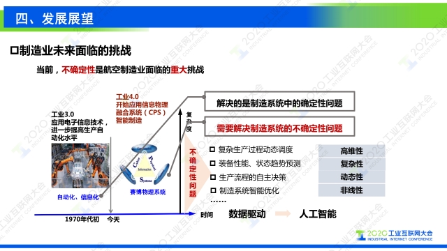 “不確定性是航空制造面臨的一個重大挑戰(zhàn)。工業(yè)3.0主要是實現自動化,解決的是制造系統(tǒng)中的確定性問題。工業(yè)4.0開始建設CAPP物理系統(tǒng),也就是我們說的CPS系統(tǒng),需要解決制造系統(tǒng)中的這么一個不確定性,例如復雜生產過程、動態(tài)調度,裝配性能狀態(tài)的趨勢預測,包括生產流程、工業(yè)流程的自主決策。整個智能制造系統(tǒng)智能化是非常重大的一個挑戰(zhàn)。為了解決未來航空制造中存在的不確定性問題,需要高校的把人工智能、工業(yè)大數據至少進行融合,高校低成本的獲取數據,并利用數據,通過數據利用不斷優(yōu)化制造過程,驅動管理優(yōu)化與變革。”