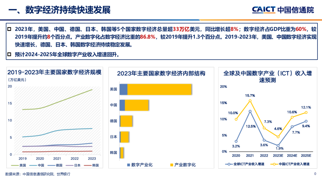 主要國家數(shù)字經濟持續(xù)快速發(fā)展。總體看,2023年,美國、中國、德國、日本、韓國等5個國家數(shù)字經濟總量超33萬億美元,同比增長超8%;數(shù)字經濟占GDP比重為60%,較2019年提升約8個百分點。2019-2023年,德國、日本、韓國數(shù)字經濟穩(wěn)定發(fā)展,美國、中國數(shù)字經濟實現(xiàn)快速增長。內部結構看,產業(yè)數(shù)字化對數(shù)字經濟增長的引擎作用持續(xù)發(fā)揮,2023年占數(shù)字經濟比重達86.8%,較2019年提升1.3個百分點;預計2024-2025年,全球數(shù)字產業(yè)收入增速回升,穩(wěn)步夯實數(shù)字經濟發(fā)展基礎。