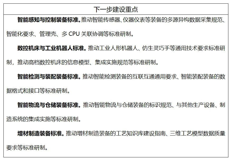 主要包括數控機床和工業機器人的運動控制、安全要求、運行維護、性能測試等通用技術標準;信息模型、數據接口、通信協議等接口與通信標準。
