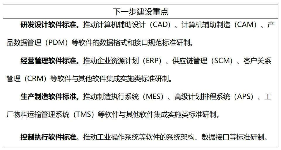 主要包括企業資源計劃(ERP)、供應鏈管理(SCM)、客戶關系管理(CRM)、人力資源管理(HRM)、質量管理系統(QMS)、資產績效管理系統(APM)、項目管理(PM)軟件等經營管理軟件應用指南和集成實施標準。