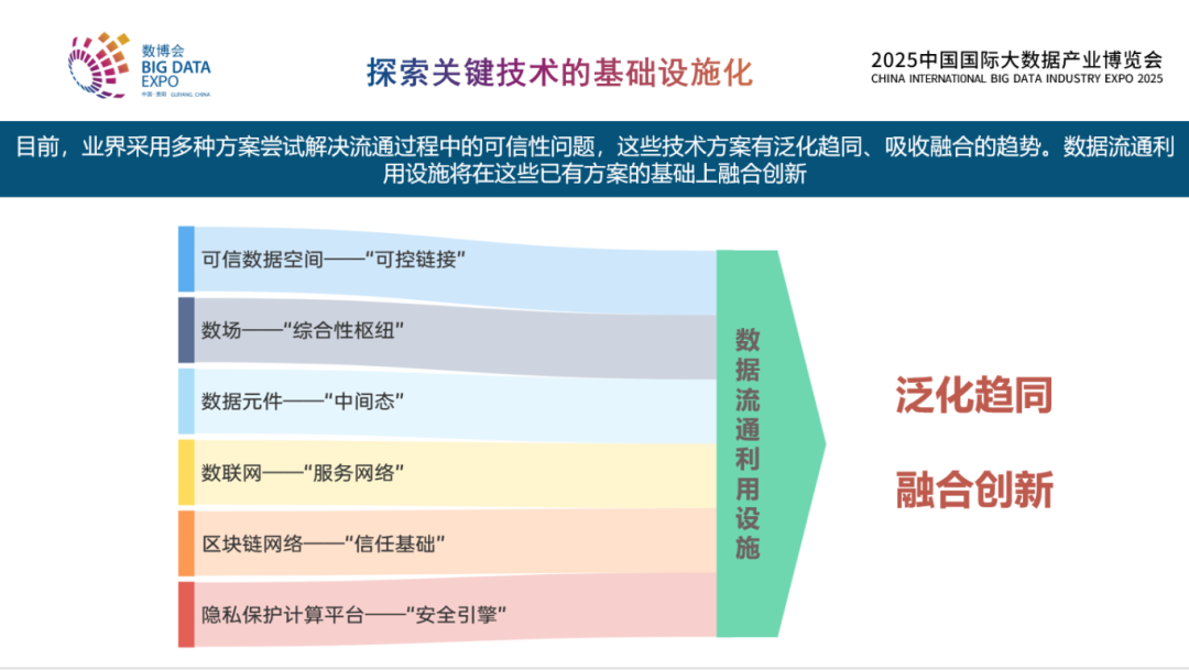 數(shù)據(jù)流通怎樣實現(xiàn)從數(shù)據(jù)本身到價值的交互?現(xiàn)在有6條技術(shù)路線,同時在探索在實踐。不同技術(shù)路線各有側(cè)重,例如可信數(shù)據(jù)空間關(guān)注可控和連接問題,數(shù)場側(cè)重綜合性樞紐問題,數(shù)據(jù)元件探索標(biāo)準(zhǔn)中間態(tài)的問題,數(shù)聯(lián)網(wǎng)強調(diào)服務(wù)網(wǎng)絡(luò)的概念,區(qū)塊鏈網(wǎng)絡(luò)提供信任基礎(chǔ),而隱私保護計算平臺強調(diào)安全引擎。各有側(cè)重,但是在收斂和融合過程中,這些技術(shù)路線會趨同于一個真正實現(xiàn)大規(guī)模數(shù)據(jù)流通所需要的一個基本功能和體系架構(gòu)。