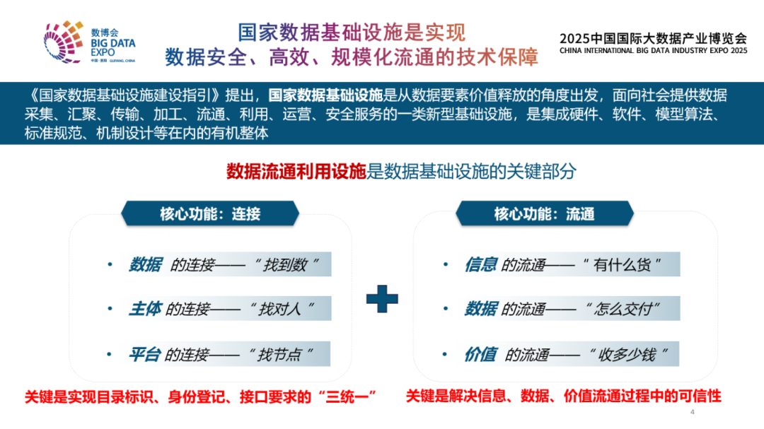 《國家數(shù)據(jù)基礎(chǔ)設(shè)施建設(shè)指引》提出了國家數(shù)據(jù)基礎(chǔ)設(shè)施的定義。數(shù)據(jù)流通利用設(shè)施是其中非常重要的一部分,而且從全球來看都是非常有探索性的。建設(shè)數(shù)據(jù)流通利用設(shè)施有兩個方面要重點考慮。一是連接,基本功能是要找到數(shù),找到主體,找到相關(guān)的技術(shù)平臺,在這里會涉及標(biāo)識目錄、身份接口統(tǒng)一的問題;二是流通,在連接的基礎(chǔ)上,完成流通,包含流通中的信息、數(shù)據(jù)的內(nèi)容、數(shù)據(jù)怎么交付、涉及的價值傳遞等,所以在這里面各個層面安全可信可控的問題。