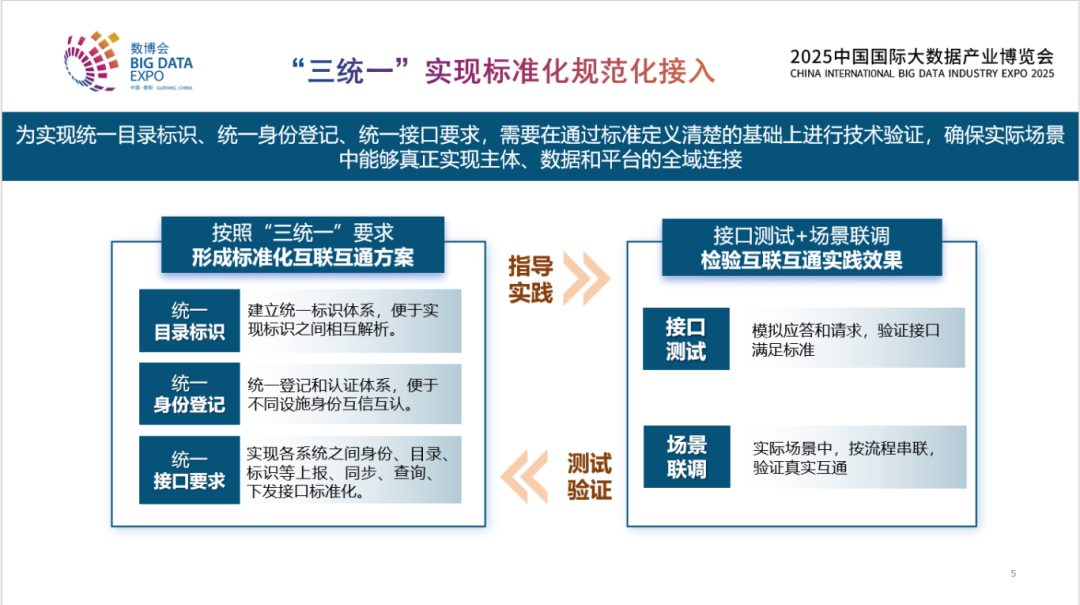 對于如何實現(xiàn)連接?《指引》中提到“三統(tǒng)一”,即統(tǒng)一的目錄標(biāo)識、統(tǒng)一的身份登記、統(tǒng)一的接口要求。統(tǒng)一的目錄標(biāo)識,包含數(shù)據(jù)里所蘊含各種各樣多維信息,我們可以去標(biāo)識它、找到它、解析它。統(tǒng)一的身份,不僅只是數(shù)據(jù)所有者,也包括跟所有利益相關(guān)方,身份都需要統(tǒng)一,這樣我們才可以在平臺上建立可信的連接。統(tǒng)一的接口,是要對所有涉及的系統(tǒng)之間目錄標(biāo)識、身份等的交互實現(xiàn)標(biāo)準(zhǔn)化。通過統(tǒng)一的目錄標(biāo)識、統(tǒng)一的身份登記、統(tǒng)一的接口要求,把分布在企業(yè)、區(qū)域里孤立的數(shù)據(jù)連接起來。為落實這些要求,國家數(shù)據(jù)局也組織了相應(yīng)的測試、聯(lián)調(diào),檢驗互聯(lián)互通的實踐成果。