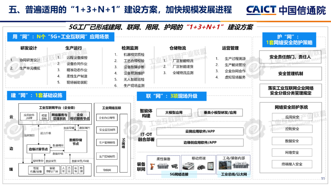 報告指出,5G工廠不是一次性建設,而是工業企業智能化、綠色化、融合化發展新的系統工程。未來,5G工廠將基于普遍適用的“1+3+N+1”建設方案,加速規模發展進程。通過新網絡、新技術、新應用、新生態等四個方面的持續創新發展,不斷提升5G工廠建設質量,塑造工業生產新模式,積極推進新型工業化。