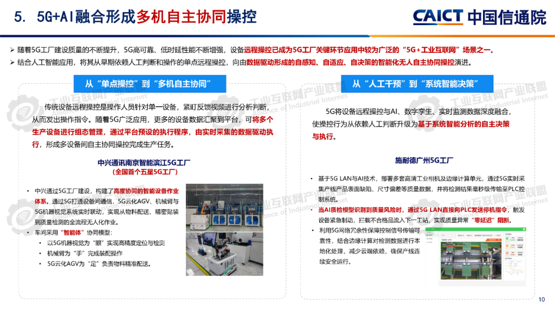 報告分析,1260個5G工廠名錄項目已覆蓋全國28個省(自治區、直轄市)、9個國民經濟門類、60個國民經濟大類。同時5G工廠作為推進工業和信息化深度融合的重要舉措,原材料工業、裝備工業、消費品工業、電子信息、能源交通等行業企業與基礎電信企業、設備及行業服務商深度合作,形成100個5G工廠典型應用實踐,各工廠平均5G網絡覆蓋率高達99.3%、現場裝備聯網率高達97.7%、無線設備5G聯網率達97%,“5G+工業互聯網”應用場景建設數量達10.5個,5G在工廠內由“單點”應用向全環節、全流程、全周期、全局、自主協同等“綜合”應用發展。一是加速企業全環節柔性生產。5G工廠推動工廠網絡無線化,通過5G全廠覆蓋,探索實現生產現場裝備云化群體控制、產線模塊化快速重構、供應鏈實時動態協同等,從而支撐企業依據市場需求,實現全環節快速調整的柔性生產方式。二是5G+數字孿生實現生產全流程精益管控。通過5G工廠系統性實施, “5G+數字孿生”已從產品研發設計、企業生產運營的可視化應用,擴展到安全生產閉環管控、廠區物流實時優化、關鍵部件精準運維等應用,實現了“虛實映射、實時監控”的工廠生產全流程精益管理。三是5G+大數據賦能企業全生命周期能碳精準管理。企業通過5G工廠建設,充分利用5G實現全廠區、全流程能源消耗與關鍵排放源數據的實時采集,構建包含碳排放監測、碳足跡核算、全鏈條碳管理等功能的能效管理體系,形成基于數據驅動的能碳精準管控模式。四是5G+AI助力實現生產全局智能發展。在5G工廠智能化服務應用要求的牽引下,工廠充分利用5G實時采集匯聚全廠及供應商相關數據,推動人工智能應用從單點輔助工具,深入到產品研發、產線生產、系統運維、企業管理等全局,形成生產供應鏈智能全局調度,產品運維智能服務等新模式。五是5G+AI融合形成多機自主協同操控。隨著5G工廠建設質量的不斷提升,5G高可靠、低時延性能不斷增強,人工智能技術的應用開發,設備遠程操控將從早期依賴人工判斷和操作的單點遠程操控,向由數據驅動的多設備自感知、自適應、自決策的智能化無人自主協同操控演進。