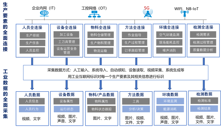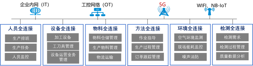 圖1:5G全連接工廠人、機、料、法、環(huán)、測等聯(lián)網(wǎng)內(nèi)容示例