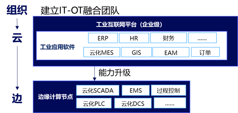 在5G全連接工廠建設中,建議改變原有工廠內(nèi)IT-OT系統(tǒng)應用建設運營方式,組織IT-OT融合團隊,對IT-OT進行一體化部署,通過應用軟件或系統(tǒng)功能的云化部署,研發(fā)面向工廠生產(chǎn)、運營、管理等需要的各類移動端應用程序(APP),建立起扁平化、靈活化 “云-邊”協(xié)同架構(gòu),形成IT-OT應用的統(tǒng)籌建設、統(tǒng)一運維、統(tǒng)一管理,并促進形成工廠內(nèi)同時要加快推進云網(wǎng)融合,實現(xiàn)網(wǎng)絡資源、計算資源、平臺資源等橫向打通,提升工廠生產(chǎn)運營管理效率。