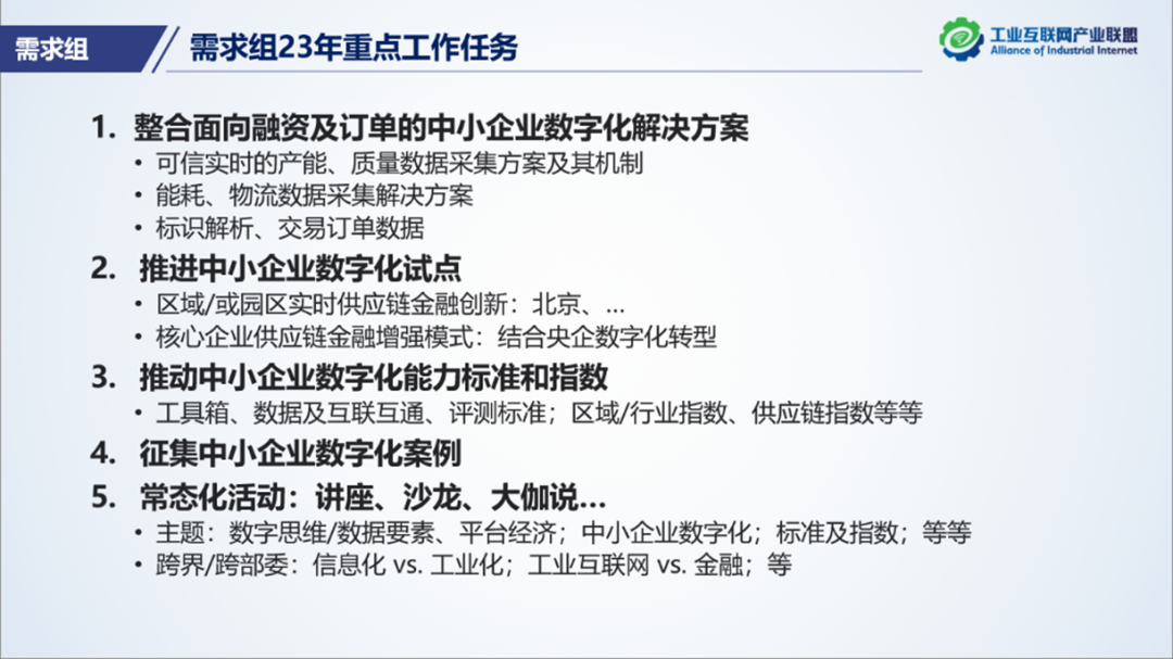 中小企業融資難題歷來備受社會關注。2022年,需求組組織工業互聯網界和金融界跨界攻關,以“中小企業實時生產行為數據”為突破口,發布《面向融資和訂單場景的中小企業基礎數字化能力指南》。本次會議圍繞中小企業可信實時的內部產能/質量數據的采集、外部物流數據、數據量化表征、風控等主題,專家們從不同視角,并就后期中小企業數字化能力標準、試點工作等,進行了熱烈討論。浙江藍卓負責的中小企業案例庫目前已征集30余項案例,未來將篩選優質案例匯編成冊。重慶創新中心的企業數據工程、博山綠色數字經濟研究院的專業質檢機構轉型云服務和創新質量檢測機制的案例引起熱議。最后達成聯合推進試點、制訂標準和構建指數等工作的共識和意向,下一步需求組將繼續聯合總體組推進。