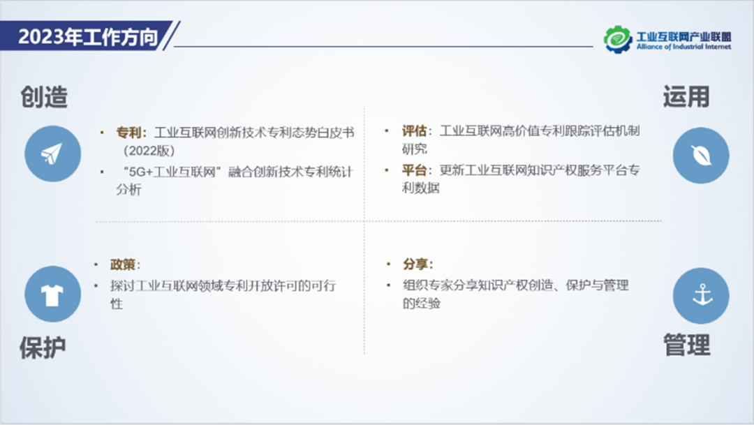 下一步,知識產權特設組將繼續推動《工業互聯網創新技術專利態勢白皮書》編寫與高價值專利的篩選,并與聯盟單位共同探索工業互聯網專利開放許可的可行性研究。同時將知識產權工作與其他工作組結合,以需求為導向推動知識產權賦能工業互聯網技術研發、企業創新和產業安全的價值體現。