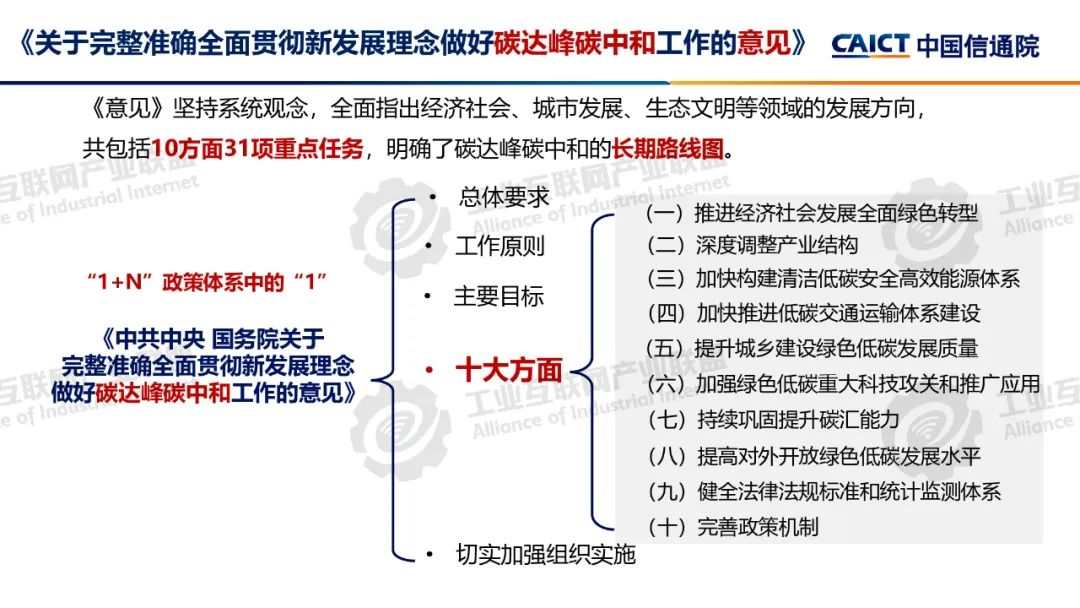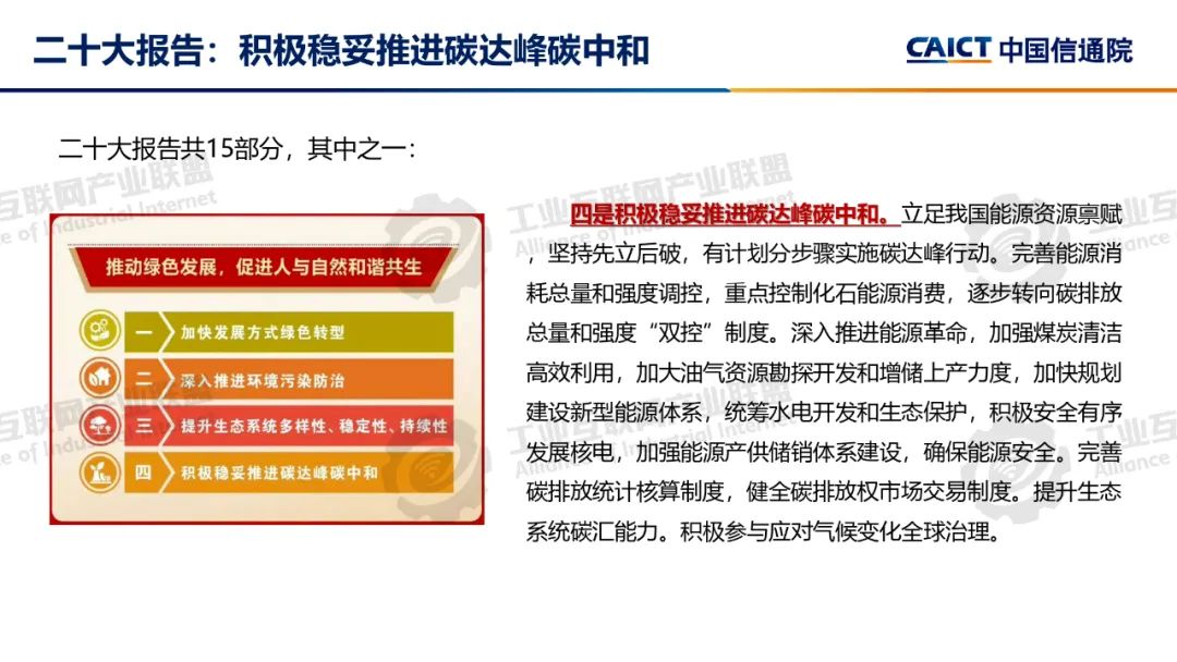 本期為您介紹由中國信息通信研究院泰爾終端實驗室副總工盧春陽分享的《碳達峰碳中和基礎知識和政策解讀》。盧春陽講解了碳達峰碳中和的科學內涵、經濟內涵和重要意義,分析了國內外能源消費結構和我國碳排放的現狀,以及碳達峰碳中和面臨的挑戰,解讀了我國碳達峰碳中和“1+N”政策體系,重點講解了《2030年前碳達峰行動方案》具體重點行動以及工業、建材和有色行業碳達峰實施方案的主要內容。