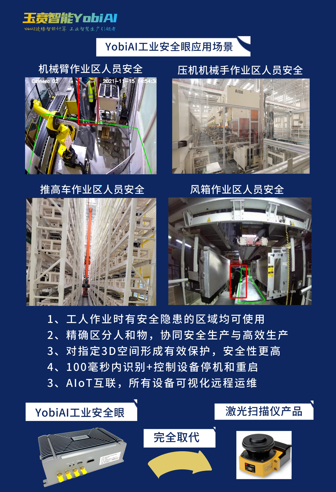 YobiAI工業安全眼應用場景當人員進入指定的3D空間內,無論是越過邊界,還是滯留在區域內,安全眼都可以在100毫秒內識別,現場即刻聲光報警+郵件或小程序報警,同時控制設備停機,直至人員退出相應區域,再自動復位。實現了從視覺感知到安全控制的閉環,使工廠安全等級由預警提升至主動安全防護,將事故直接扼殺在搖籃,避免了人財物的損失。真正做到了主動安全、智能管理。