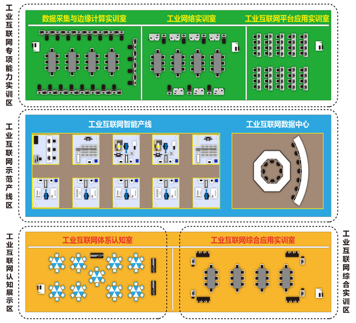 工業互聯網專項能力實訓區域:工業互聯網專項能力實訓區將規劃有工業網絡實訓室、數據采集與邊緣計算實訓室和工業互聯網平臺應用實訓室等實訓環境,基于技術領域視角,覆蓋了工業互聯網技術領域的感知控制層、網絡層、平臺層、應用層的實訓教學,能夠讓學生基本掌握工業互聯網平臺實施部署、運營維護、技術應用等專項技術應用能力。