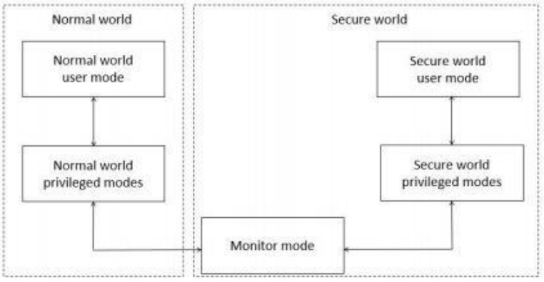 兩個(gè)虛擬核以基于時(shí)間片的方式運(yùn)行,根據(jù)需要實(shí)時(shí)占用物理核,并通過(guò)MonitorMode在安全世界和非安全世界之間切換,類似同一CPU下的多應(yīng)用程序環(huán)境,不同的是多應(yīng)用程序環(huán)境下操作系統(tǒng)實(shí)現(xiàn)的是進(jìn)程間切換,而Trustzone下的MonitorMode實(shí)現(xiàn)同一CPU上兩個(gè)操作系統(tǒng)間的切換。