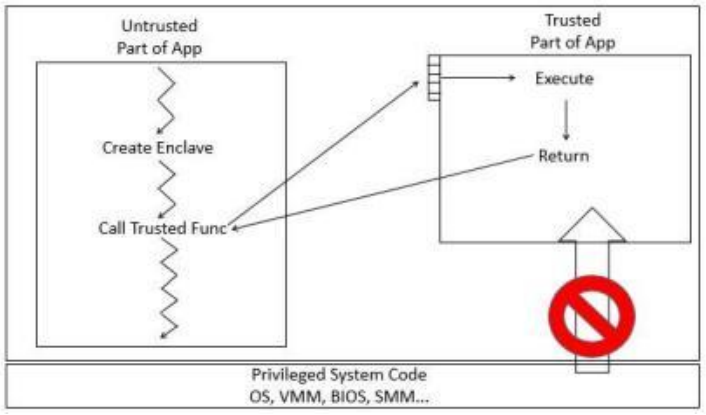 SGX允許用戶態(tài)及內(nèi)核態(tài)代碼定義將特定內(nèi)存區(qū)域,設(shè)置為私有區(qū)域,此區(qū)域也被稱為飛地(Enclave)。其內(nèi)容受到保護(hù),不能被本身以外的任何進(jìn)程存取,包括高權(quán)限級(jí)別運(yùn)行的進(jìn)程(例如操作系統(tǒng)內(nèi)核進(jìn)程)。