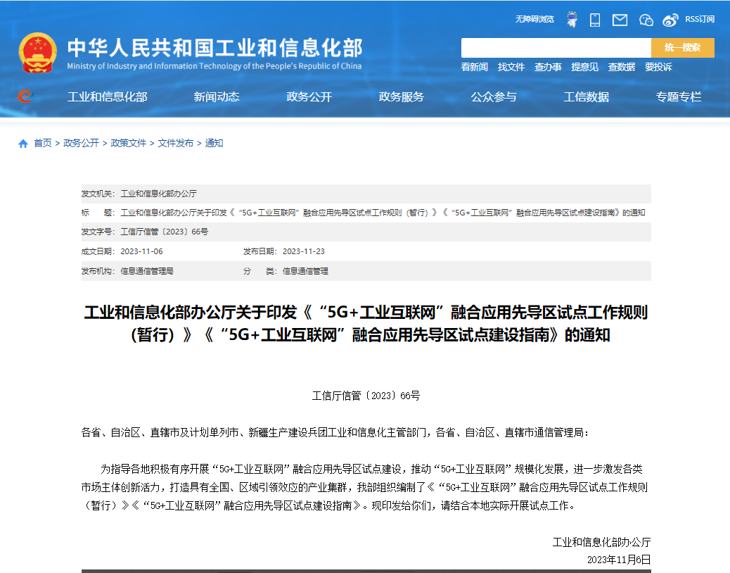 11月23日,工業(yè)和信息化部印發(fā)《“5G+工業(yè)互聯(lián)網(wǎng)”融合應(yīng)用先導(dǎo)區(qū)試點工作規(guī)則(暫行)》《“5G+工業(yè)互聯(lián)網(wǎng)”融合應(yīng)用先導(dǎo)區(qū)試點建設(shè)指南》,深入實施工業(yè)互聯(lián)網(wǎng)創(chuàng)新發(fā)展戰(zhàn)略,加強“5G+工業(yè)互聯(lián)網(wǎng)”融合應(yīng)用先導(dǎo)區(qū)試點管理工作,發(fā)揮先導(dǎo)區(qū)試點引領(lǐng)帶動效應(yīng),促進“5G+工業(yè)互聯(lián)網(wǎng)”規(guī)模化發(fā)展。