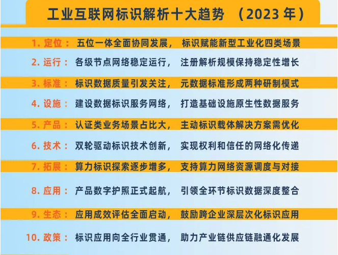 工業(yè)互聯(lián)網(wǎng)標(biāo)識解析十大趨勢是標(biāo)識產(chǎn)業(yè)每年的風(fēng)向標(biāo)。11月14日,在2023年工業(yè)互聯(lián)網(wǎng)標(biāo)識大會(江蘇)上,中國信通院發(fā)布了工業(yè)互聯(lián)網(wǎng)標(biāo)識解析十大趨勢(2023年)。該趨勢從標(biāo)識解析體系的定位、運行、標(biāo)準(zhǔn)、設(shè)施、產(chǎn)品、技術(shù)、拓展、應(yīng)用、生態(tài)和政策這十個角度,關(guān)注已在產(chǎn)業(yè)鏈上下游形成強大生態(tài)的技術(shù),著眼于前沿技術(shù)的探索與實踐驗證,以洞察標(biāo)識解析技術(shù)在新型工業(yè)化中的角色轉(zhuǎn)換、產(chǎn)業(yè)創(chuàng)新和應(yīng)用場景的演變。