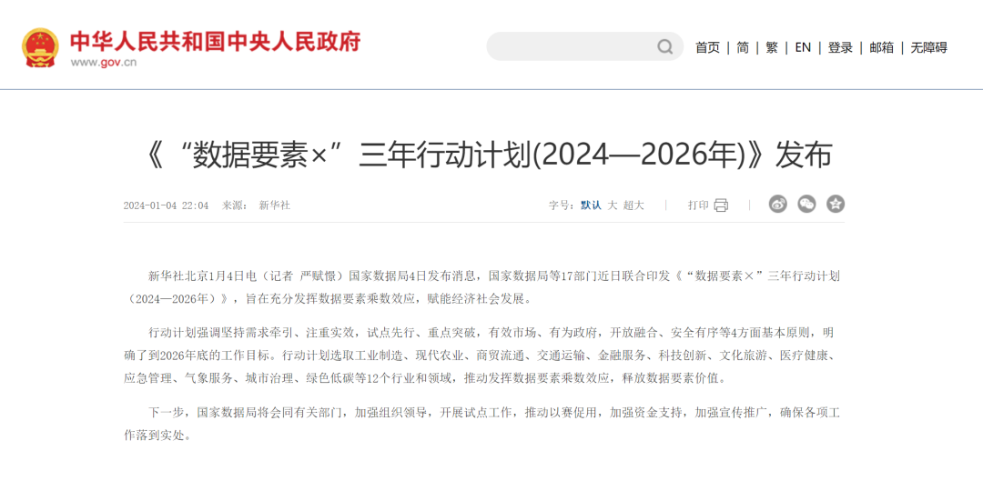12月31日,國家數(shù)據(jù)局等17部門聯(lián)合印發(fā)《“數(shù)據(jù)要素×”三年行動計劃(2024—2026年)》。該計劃是為深入貫徹落實習(xí)近平總書記關(guān)于發(fā)揮數(shù)據(jù)要素作用的重要指示精神和黨中央、國務(wù)院決策部署,發(fā)揮數(shù)據(jù)要素乘數(shù)效應(yīng),賦能經(jīng)濟社會發(fā)展,特制訂的行動計劃。