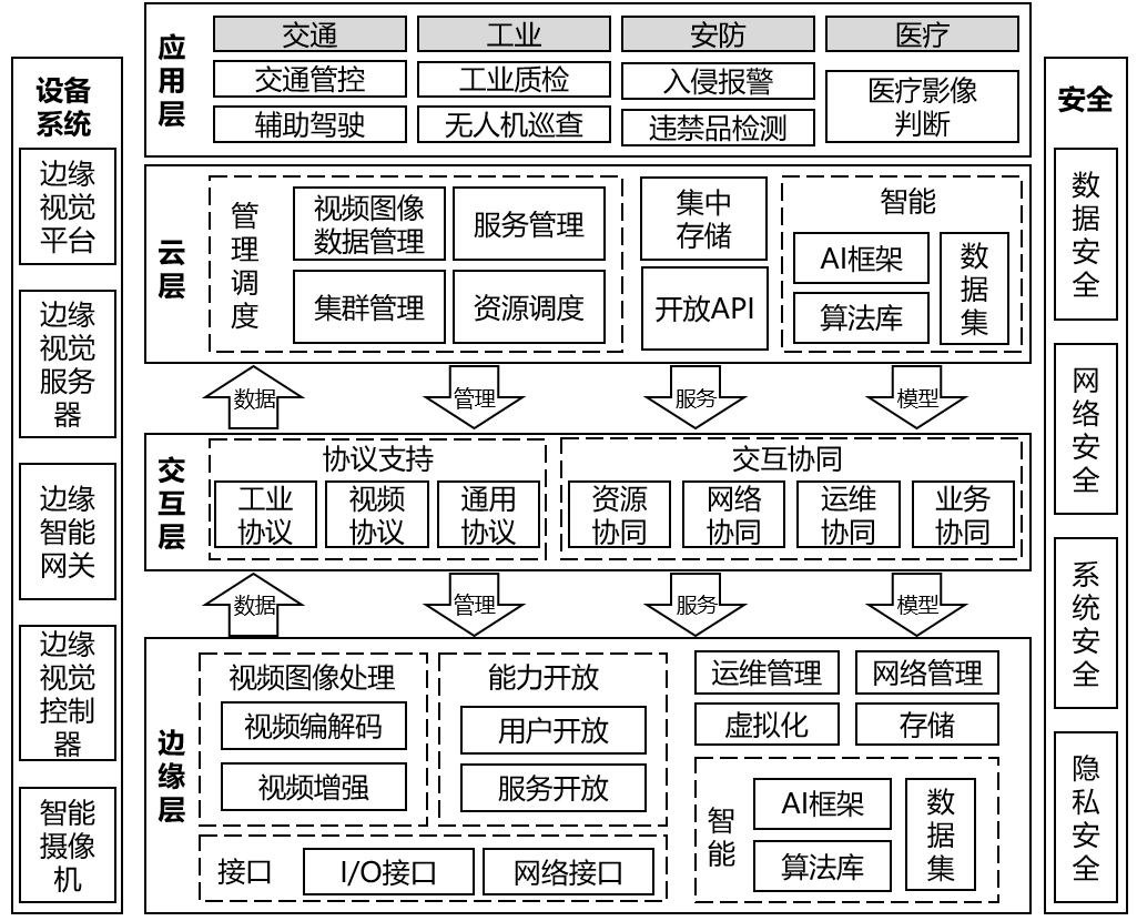 邊緣計算機器視覺系統(tǒng)主要包括智能攝像機、邊緣視覺控制器、邊緣智能網(wǎng)關(guān)、邊緣視覺服務器、邊緣視覺平臺等。本測試對邊緣計算機器視覺系統(tǒng)的接口、協(xié)議、視頻處理、算法模型、協(xié)同管理、存儲能力、開放交互、安全能力等方面提出要求。