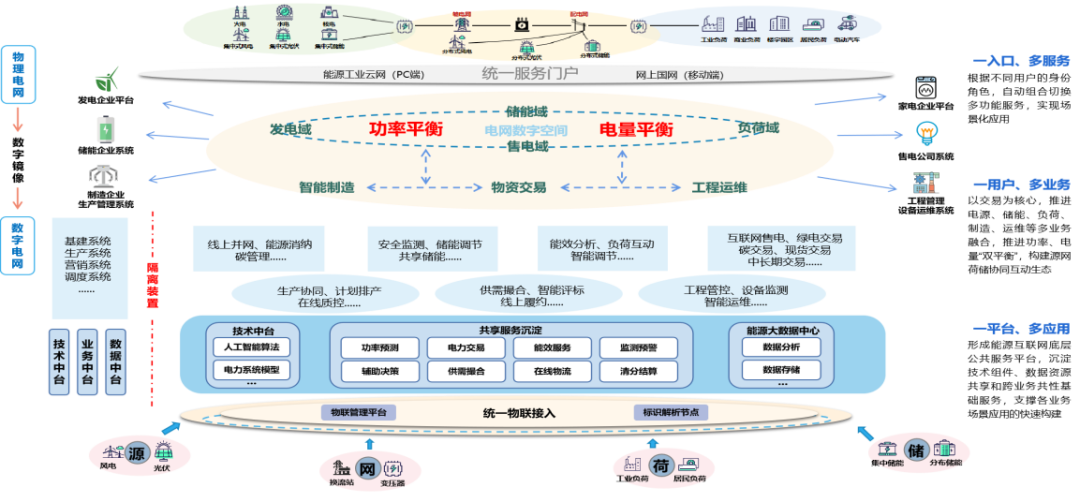 下一層是電力運營的發(fā)電、儲能、負荷、售電域四大領(lǐng)域間的協(xié)同工作,確保電力系統(tǒng)的平衡和高效運行。并給出電力供應(yīng)鏈支撐場景,通過智能制造、物資交易、工程運維等實現(xiàn)供應(yīng)鏈的高效管理和優(yōu)化。再給出平臺支撐的線上業(yè)務(wù)場景,電力能源供應(yīng)鏈和電力運營的細化線上場景,通過技術(shù)和服務(wù)平臺實現(xiàn)更高效、靈活和智能的電力管理。最下層是物理實體世界的數(shù)字化:按源、網(wǎng)、荷、儲電力運營四大領(lǐng)域數(shù)字化,而不是堆砌設(shè)備。