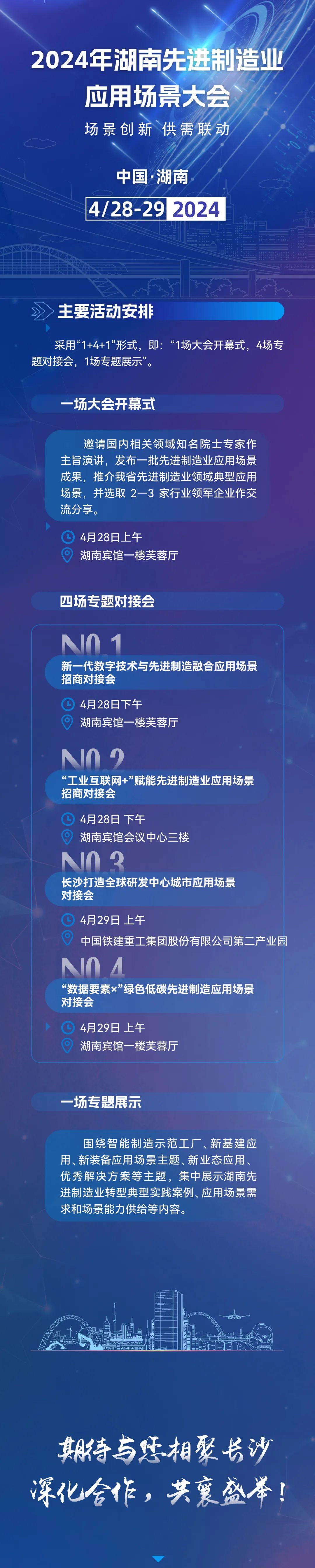 4月28日-29日,由湖南省商務廳、省發(fā)展改革委、省科技廳、省工業(yè)和信息化廳、省國資委、省數(shù)據(jù)局、長沙市人民政府共同主辦的2024年湖南先進制造業(yè)應用場景大會將于湖南長沙舉行。