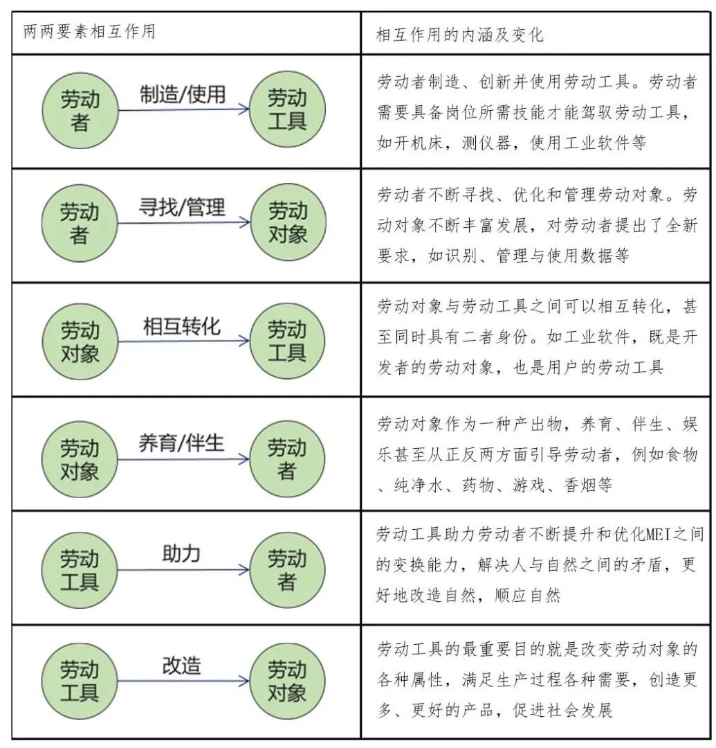 由圖2生產(chǎn)力三要素新模型看到,三要素之間的各個(gè)要素是彼此兩兩相互作用的。相互作用的結(jié)果及其內(nèi)涵變化,如表1所示。