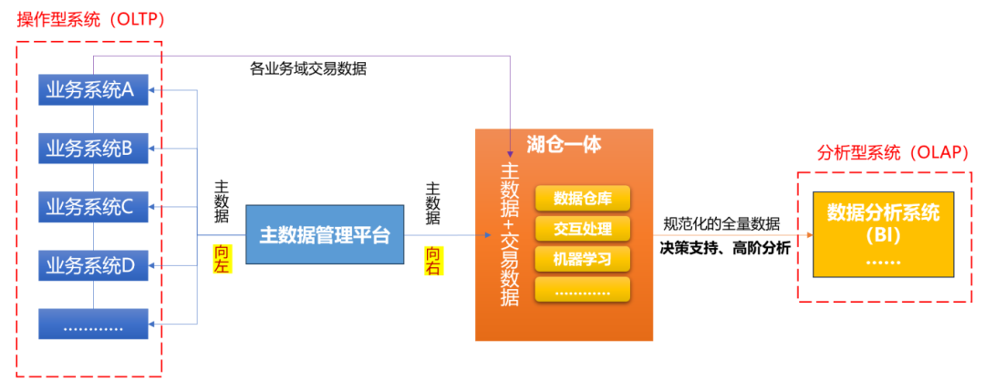 目前主數(shù)據(jù)管理平臺(tái)承擔(dān)著一種比較特殊的角色,介于數(shù)據(jù)交易側(cè)和數(shù)據(jù)分析側(cè)之間,兼具源頭業(yè)務(wù)IT系統(tǒng)和數(shù)據(jù)倉(cāng)庫(kù)等平臺(tái)的特點(diǎn)。當(dāng)主數(shù)據(jù)管理系統(tǒng)作為數(shù)據(jù)記錄的產(chǎn)生源頭,承擔(dān)著共性業(yè)務(wù)流程執(zhí)行的功能;當(dāng)主數(shù)據(jù)管理系統(tǒng)作為主數(shù)據(jù)記錄分發(fā)交換的源頭時(shí),又承擔(dān)著數(shù)據(jù)架構(gòu)管控的職責(zé)。隨著企業(yè)核心系統(tǒng)統(tǒng)建、能力大集中、數(shù)據(jù)統(tǒng)一入湖和全局治理體系建設(shè)工作的深入開(kāi)展,未來(lái)主數(shù)據(jù)管理平臺(tái)的職責(zé)可以向左和向右遷移。
