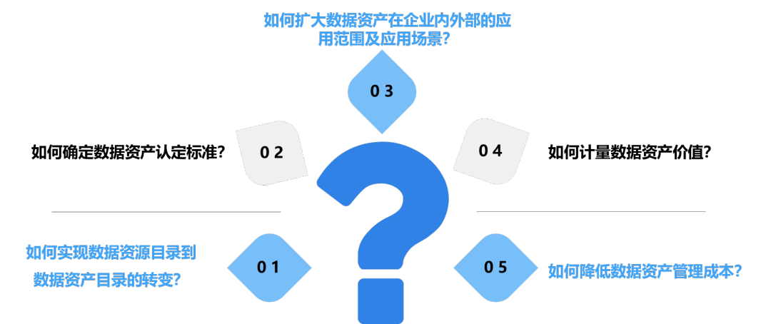 在數(shù)據(jù)資源化階段,企業(yè)普遍搭建了大數(shù)據(jù)平臺(tái),實(shí)現(xiàn)了數(shù)據(jù)的匯聚,建立了數(shù)據(jù)資源目錄。但是,在邁入數(shù)據(jù)資產(chǎn)化階段仍面臨五個(gè)主要問(wèn)題。