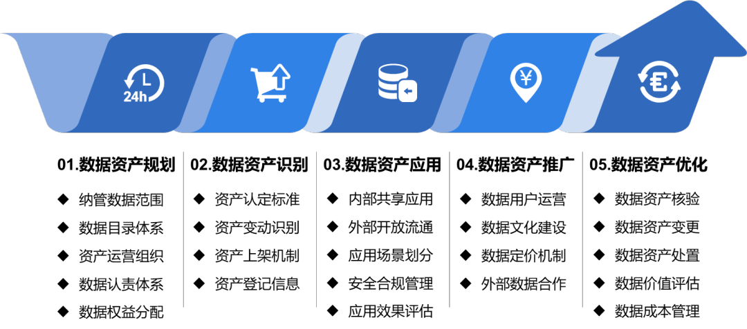 通過(guò)調(diào)研和評(píng)估觀察,我們總結(jié)出數(shù)據(jù)資產(chǎn)全運(yùn)營(yíng)“五步法”:數(shù)據(jù)資產(chǎn)規(guī)劃、數(shù)據(jù)資產(chǎn)識(shí)別、數(shù)據(jù)資產(chǎn)應(yīng)用、數(shù)據(jù)資產(chǎn)推廣、數(shù)據(jù)資產(chǎn)優(yōu)化。