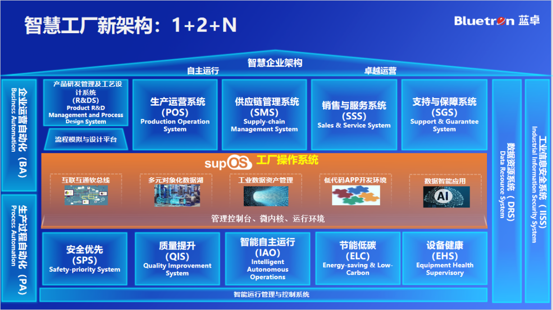 藍卓持續探索一條適合大規模、低成本推進智能制造的路徑。2023年,藍卓創新打造“1+2+N”的智慧工廠新架構。即1個工廠操作系統supOS;2個自動化,一個是生產過程自動化,一個是企業經營管理自動化;以及N個工業軟件。基于supOS平臺,對企業各類數據統一集中管理,貫通兩個自動化,同時,基于工業APP組合應用,賦能企業數字化轉型。目前,該“中國方案”正揚帆出海,成功應用于沙特阿美、巴斯夫、Indorama、馬來西亞國家石油等海外龍頭企業。