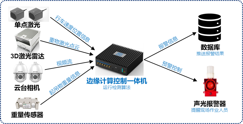 重物起吊是車間中最常見的高風險作業(yè)場景,東方研究院基于EC13211研發(fā)了重物起吊作業(yè)安全預警系統(tǒng),控制器安裝于行車上,就近接入單點激光、3D激光雷達、工業(yè)攝像頭和其他傳感器,進行實時的數(shù)據(jù)采集、姿態(tài)感知和AI視覺處理,具有較高的檢測實時性。系統(tǒng)可在起吊作業(yè)過程中對吊運物下方站人和吊運物前進方向有人等安全風險進行智能識別與安全預警,提醒行車駕駛員及時停止作業(yè),并上傳報警信息。該系統(tǒng)集起吊作業(yè)監(jiān)控、風險預警、違規(guī)報警于一體,極大地降低了重物起吊作業(yè)中的安全風險。
