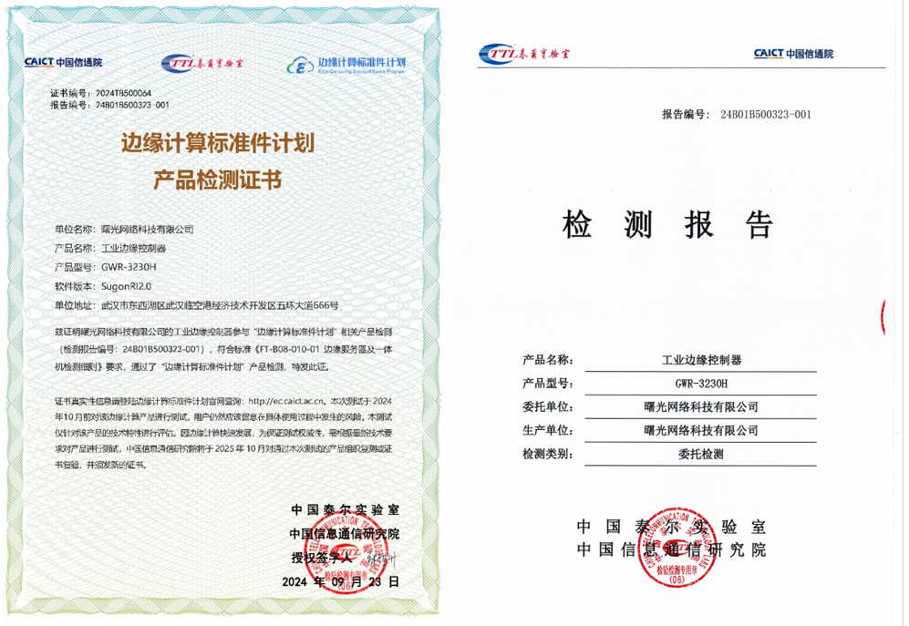 曙光網絡科技有限公司自主研發的工業邊緣控制器GWR-3230H順利通過本次“邊緣計算標準件計劃”產品測試,已在我國多個行業領域實現廣泛應用部署,有力推動我國多個關鍵領域客戶新型工業化發展邁向新階段。