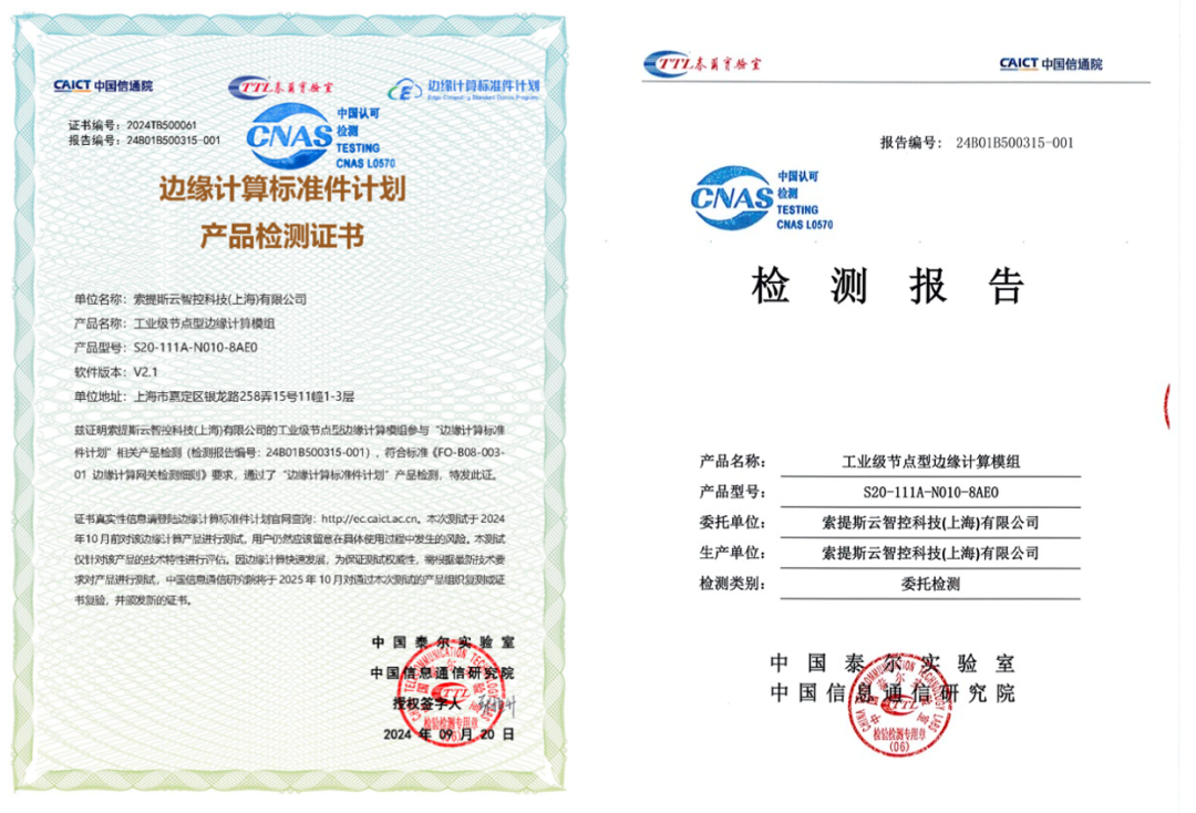 經過中國信息通信研究院集中測試,索提斯云智控科技(上海)有限公司自主研發的工業級節點型邊緣計算模組S20順利通過“邊緣計算標準件計劃”產品測試,并已在多個行業領域實現工廠級部署及穩定運行,助力各行各業打通IT與OT連接,賦能企業數字化轉型。
