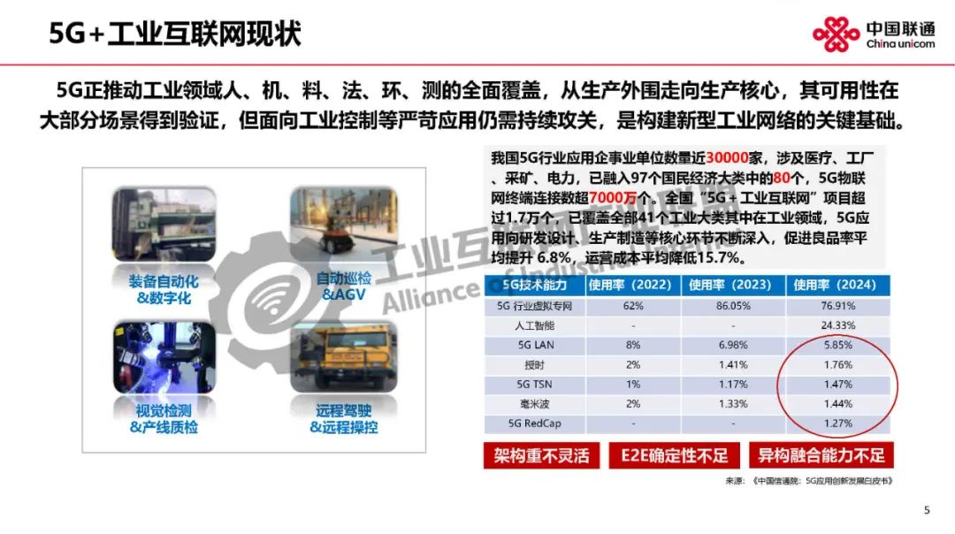 5G正推動工業(yè)領(lǐng)域人、機、料、法、環(huán)、測的全面覆蓋,從生產(chǎn)外圍走向生產(chǎn)核心,其可用性在大部分場景得到驗證,但面向工業(yè)控制等嚴苛應(yīng)用仍需持續(xù)攻關(guān),是構(gòu)建新型工業(yè)網(wǎng)絡(luò)的關(guān)鍵基礎(chǔ)。