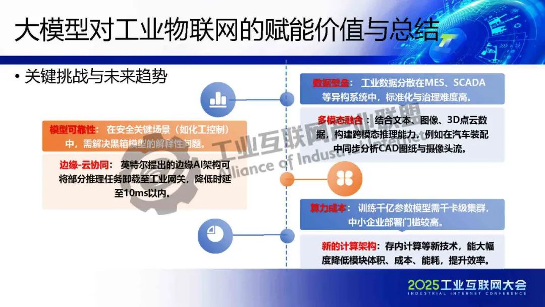 徐明介紹,工業(yè)大模型正從概念驗(yàn)證走向規(guī)模化落地,其價(jià)值不僅體現(xiàn)在效率提升,更在于重構(gòu)制造業(yè)的知識沉淀與決策范式。在數(shù)據(jù)安全、模型可信、成本控制等維度建立標(biāo)準(zhǔn)化解決方案,實(shí)現(xiàn)技術(shù)與產(chǎn)業(yè)的雙向賦能。未來,隨著5G-A/6G通信、神經(jīng)擬態(tài)芯片等技術(shù)的突破,工業(yè)物聯(lián)網(wǎng)將形成更高效、安全的智能網(wǎng)絡(luò)。企業(yè)需關(guān)注垂直場景的深度定制,同時(shí)平衡技術(shù)創(chuàng)新與社會倫理,方能實(shí)可持續(xù)的智能化轉(zhuǎn)型。