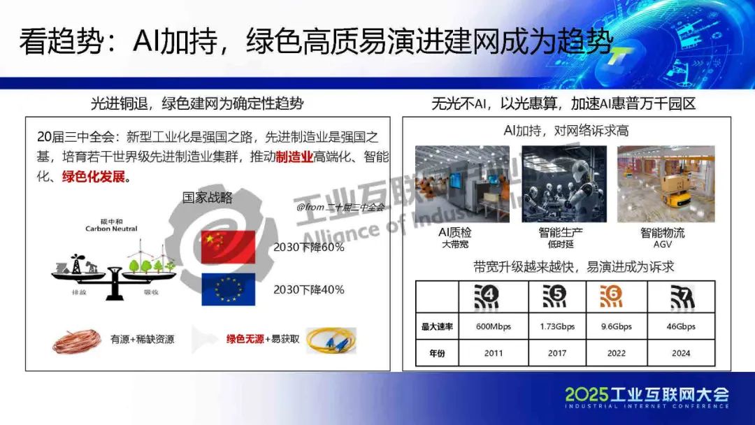 龔奎介紹,在工業(yè)園區(qū)網(wǎng)絡(luò)建設(shè)中,光進(jìn)銅退是大趨勢(shì),F(xiàn)5G-A全光園區(qū)方案因光纖介質(zhì)易獲取、無(wú)源傳輸?shù)葍?yōu)勢(shì),可實(shí)現(xiàn)綠色節(jié)能,且能更好滿(mǎn)足AI應(yīng)用對(duì)大帶寬、低時(shí)延的要求。國(guó)家政策也支持PON技術(shù)在園區(qū)應(yīng)用。華為的F5G-A園區(qū)網(wǎng)絡(luò)解決方案,具有綠色、高質(zhì)、易演進(jìn)特點(diǎn),采用光纖到機(jī)器、無(wú)源分光器等技術(shù),可節(jié)省部件成本80%以上,減少弱電機(jī)柜需求,還具備長(zhǎng)生命周期、強(qiáng)抗干擾性、相對(duì)無(wú)限帶寬等優(yōu)勢(shì),能適應(yīng)技術(shù)快速演進(jìn)。如某電池工廠(chǎng)應(yīng)用后,綜合造價(jià)成本降低30%以上,客戶(hù)滿(mǎn)意度提升。目前,已聯(lián)合各方發(fā)布F5G-A在工業(yè)園區(qū)的標(biāo)準(zhǔn),推動(dòng)產(chǎn)業(yè)發(fā)展。