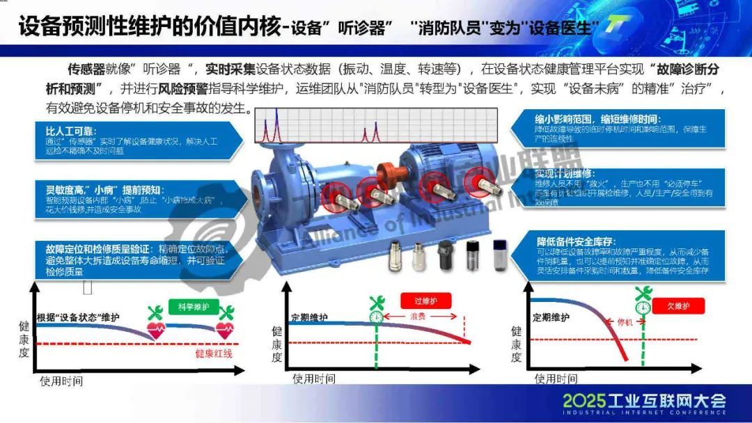 傳感器就像”聽診器“,實時采集設(shè)備狀態(tài)數(shù)據(jù),在設(shè)備狀態(tài)健康管理平臺實現(xiàn)“故障診斷分析和預測”,并進行風險預警指導科學維護,運維團隊從"消防隊員"轉(zhuǎn)型為"設(shè)備醫(yī)生",實現(xiàn)“設(shè)備未病”的精準”治療”,有效避免設(shè)備停機和安全事故的發(fā)生。