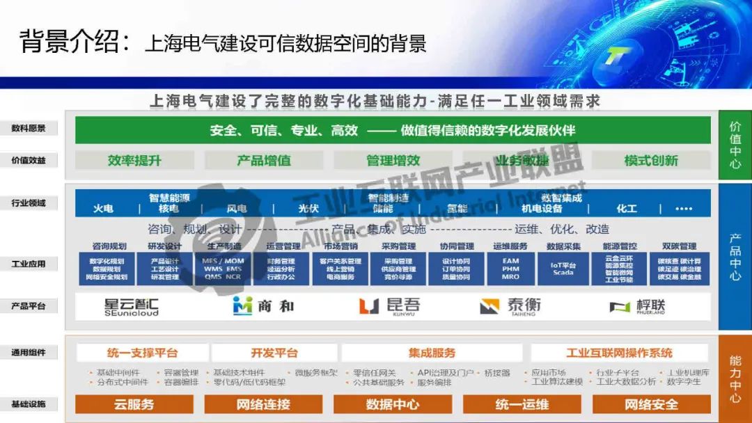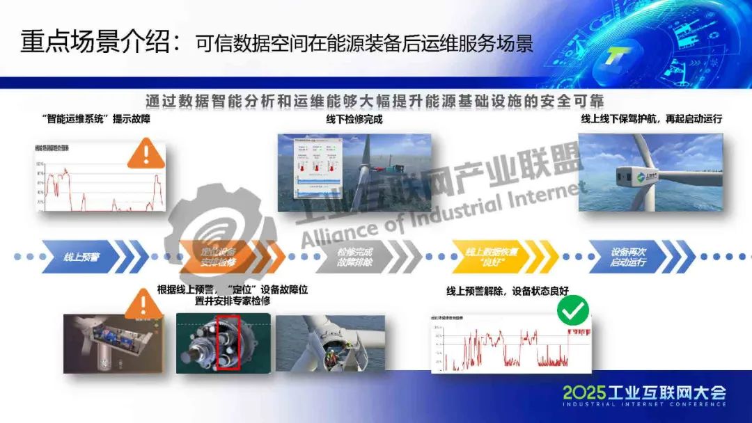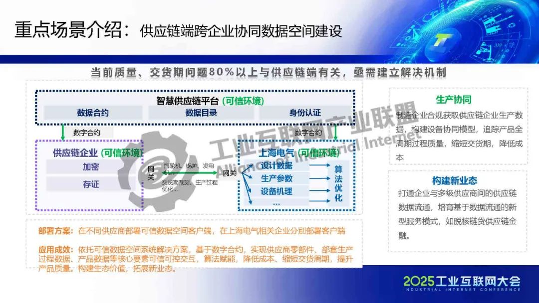 黃猛介紹,可信數據空間作為重要的數據流通基礎設施,依托上海電氣在能源和工業裝備領域的全產業門類及豐富數據場景,構建了數字化基礎能力,包括星云智匯工業互聯網和智慧供應鏈平臺,實現了全要素數據連接與跨企業協同。該平臺基于工業互聯網底座,整合區塊鏈、隱私計算、身份管理等技術,確保數據安全與跨域使用控制。重點應用場景包括能源裝備后運維服務,通過數據智能分析提升安全可靠性,并驅動新能源行業AI應用;以及供應鏈端跨企業協同,通過可信數據空間解決質量與交貨期問題,實現金融普惠、綠色供應鏈和雙碳目標。