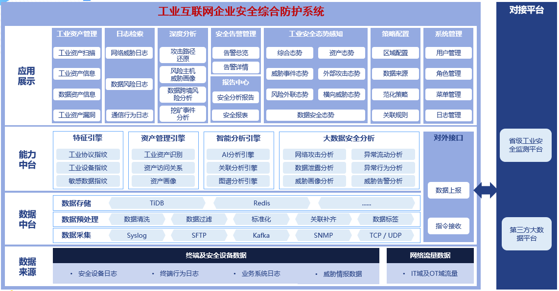 國家工業(yè)互聯網安全態(tài)勢感知與風險預警平臺:建立國家、省級、企業(yè)級聯動的工業(yè)互聯網安全監(jiān)管體系,實現重點行業(yè)、重點對象、重點風險的實時監(jiān)測、動態(tài)感知、及時預警,支撐政府監(jiān)管、服務企業(yè)防護。
