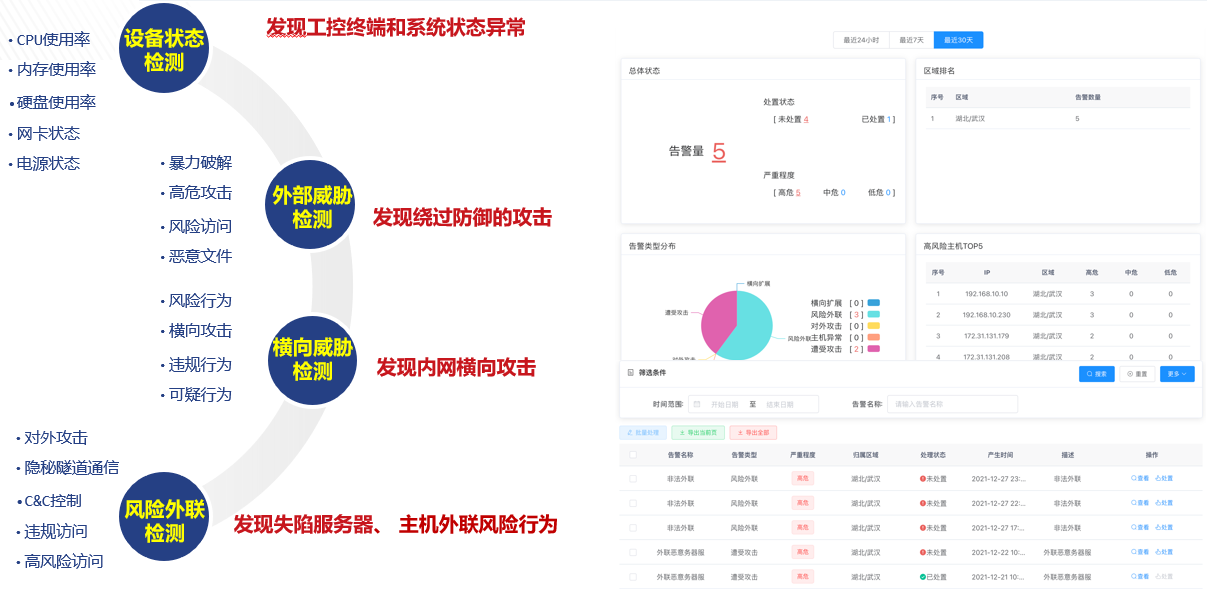 支持安全合規(guī)檢測、異常攻擊檢測、非法外聯檢測、設備運行狀態(tài)檢測、內網異常訪問檢測、非法程序啟動檢測、APT攻擊檢測、惡意加密流量檢測等。