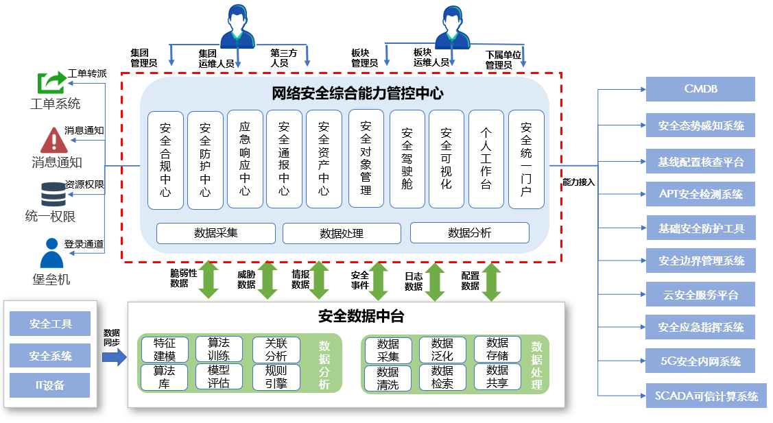 安全綜合能力管控平臺(tái)采用集團(tuán)集中部署,用戶分權(quán)分域模式建設(shè),支持微服務(wù)架構(gòu),通過(guò)集團(tuán)側(cè)安全工具的集中納管、安全能力的分類調(diào)用,以IPDRR模型為指引構(gòu)建安全能力中心,為浙能集團(tuán)及下屬單位安全運(yùn)營(yíng)人員提供安全服務(wù)。建設(shè)安全合規(guī)中心、安全監(jiān)測(cè)中心、安全防護(hù)中心、應(yīng)急響應(yīng)中心,依托浙能集團(tuán)數(shù)據(jù)中臺(tái)安全數(shù)據(jù)實(shí)現(xiàn)安全駕駛艙,在滿足安全監(jiān)管要求的同時(shí),具備網(wǎng)絡(luò)安全中臺(tái)演進(jìn)能力,為浙能集團(tuán)安全建設(shè)降本增效,解決浙能集團(tuán)安全設(shè)備管理建設(shè),安全運(yùn)營(yíng)缺乏協(xié)同等問(wèn)題。