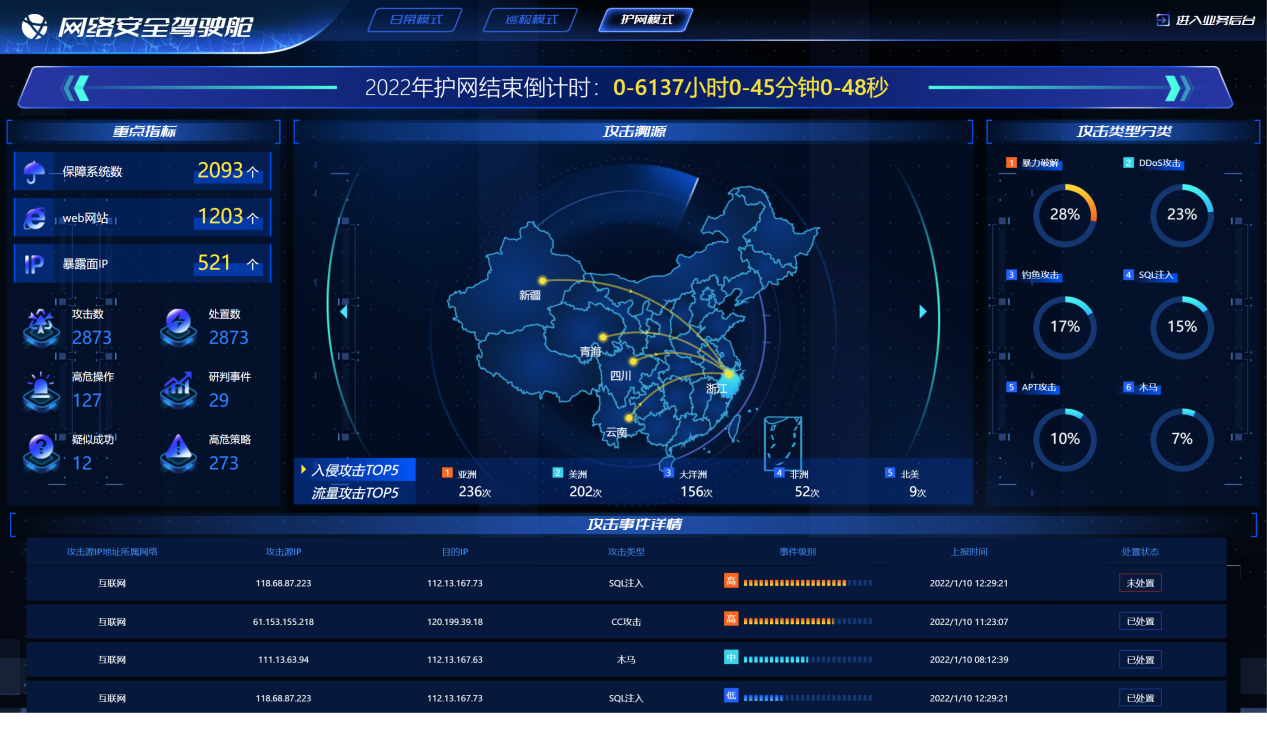 將獲取到的威脅數(shù)據(jù)、脆弱性數(shù)據(jù)與資產(chǎn)數(shù)據(jù)進(jìn)行關(guān)聯(lián),形成網(wǎng)絡(luò)安全決策依據(jù),構(gòu)建安全駕駛艙,從日常模式、巡檢模式、護(hù)網(wǎng)模式多維度展現(xiàn)安全工作的重點(diǎn)關(guān)注指標(biāo),反映網(wǎng)絡(luò)運(yùn)行及安全狀態(tài),將安全風(fēng)險(xiǎn)形象、直觀地呈現(xiàn)給安全決策者和管理人員,方便安全運(yùn)營(yíng)管理者全局掌握浙能集團(tuán)網(wǎng)絡(luò)安全風(fēng)險(xiǎn)及運(yùn)行情況,為安全工作提供決策支撐。
