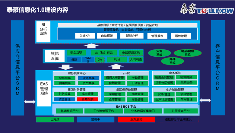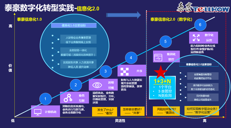 泰豪數(shù)字化轉(zhuǎn)型也是隨著企業(yè)發(fā)展的歷程而不斷發(fā)展。第一次和金蝶攜手是在2001年,隨著企業(yè)的發(fā)展,我們也是不斷在選擇更合適泰豪的解決方案。2016年隨著泰豪二次創(chuàng)業(yè)的目標(biāo),我們?cè)俅魏徒鸬隽藬?shù)字化轉(zhuǎn)型1.0的建設(shè),將集團(tuán)財(cái)務(wù)、HR、業(yè)務(wù)管理一體化進(jìn)行了全方位合作。最近兩年我們與金蝶在進(jìn)行數(shù)字化轉(zhuǎn)型2.0的設(shè)計(jì)。1.0目標(biāo)還是比較基礎(chǔ),就是做人財(cái)物、全線上、業(yè)財(cái)一體、人才共享。2.0希望做到集團(tuán)戰(zhàn)略管控,實(shí)現(xiàn)數(shù)字化業(yè)務(wù)的賦能,實(shí)時(shí)洞察經(jīng)營(yíng)管理風(fēng)險(xiǎn),降低運(yùn)營(yíng)管理成本。