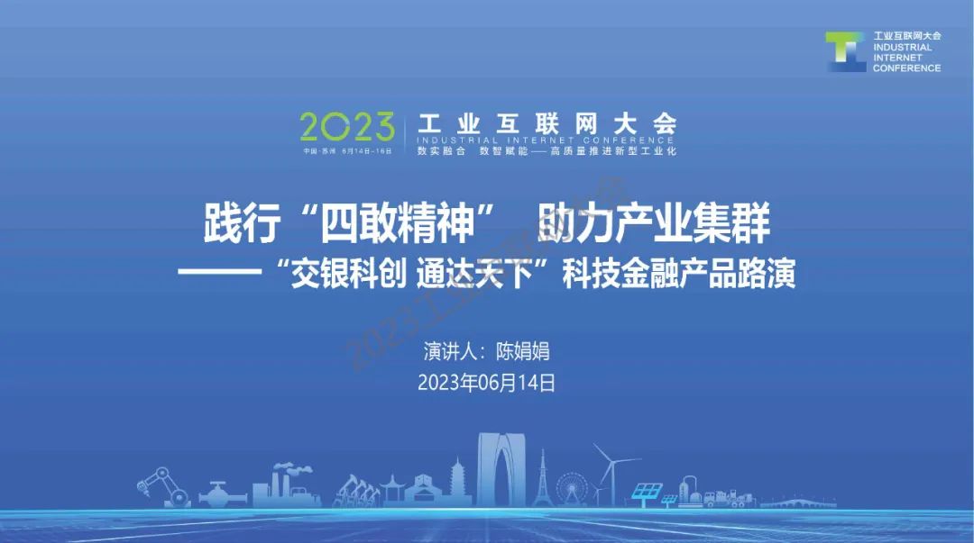 6月14日,在2023工業互聯網大會“工業互聯網產融推進論壇”上,交通銀行蘇州分行普惠金融事業部副總經理陳娟娟發表了《踐行“四敢精神”助力產業集群——“交銀科創 通達天下”科技金融產品路演》的主題演講。
