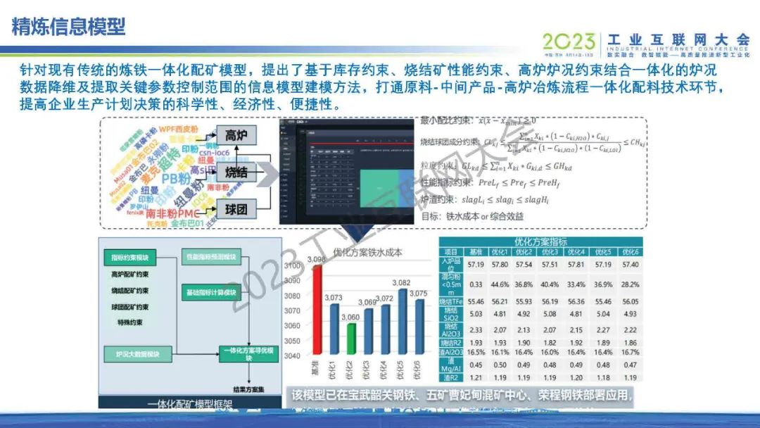 “針對現有傳統的煉鐵一體化配礦模型,提出了基于庫存約束、燒結礦性能約束、高爐爐況約束結合一體化的爐況數據降維及提取關鍵參數控制范圍的信息模型建模方法,打通原料-中間產品-高爐冶煉流程一體化配料技術環節,提高企業生產計劃決策的科學性、經濟性、便捷性。”