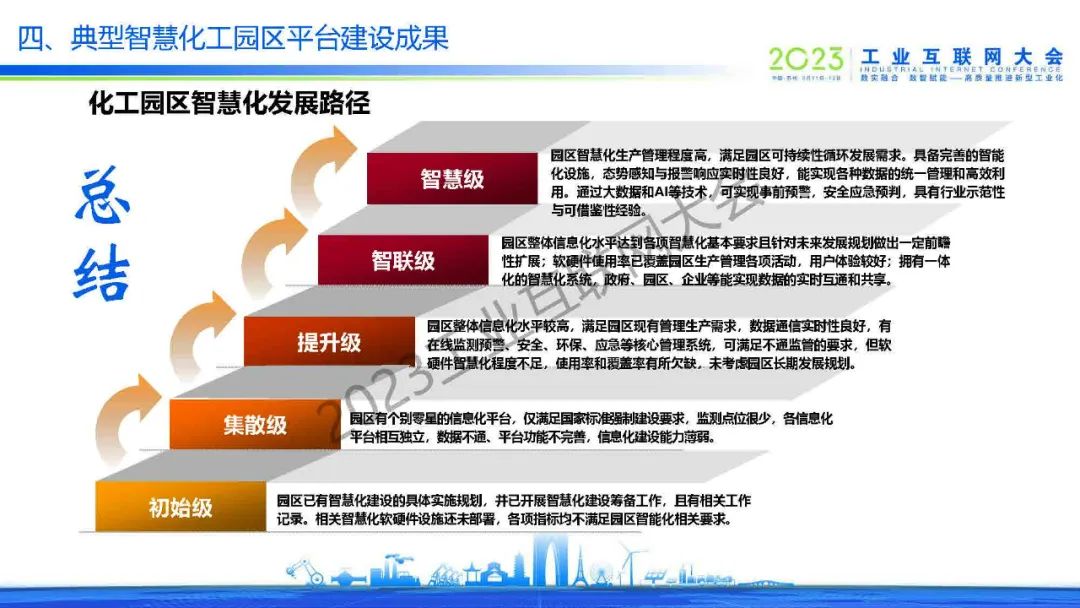 馬從越介紹,智慧化工園區(qū)是以信息與通信技術(shù)為支撐,圍繞安全生產(chǎn)、環(huán)境管理、應(yīng)急管理、封閉化管理、運輸管理、能原管理、辦公管理、公共服務(wù)和保障體系等領(lǐng)域,通過數(shù)據(jù)整合與信息平臺建設(shè)實現(xiàn)智慧化管理與高效運行的化工園區(qū)。化工園區(qū)智慧化發(fā)展路徑從初始級、集散級、提升級、智聯(lián)級到最后的智慧級。