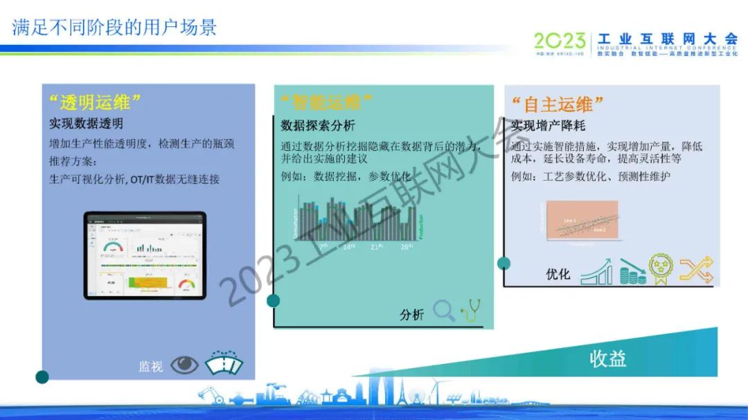 “針對運維部分,工業邊緣可以提供數據的監視、分析、優化等不同的維度。增加生產性能透明度,檢測生產的瓶頸,通過數據分析挖掘隱藏在數據背后的潛力,并給出實施的建議,最終通過實施智能措施,實現增加產量,降低成本,延長設備壽命,提高靈活性等,做到自主運維,滿足不同階段的用戶的場景。”