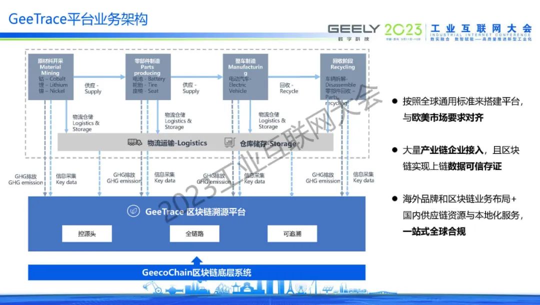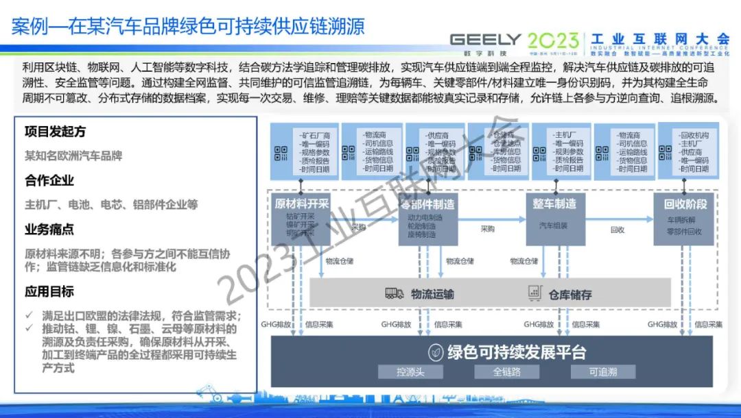 “利用區(qū)塊鏈、物聯(lián)網(wǎng)、人工智能等數(shù)字科技,結(jié)合碳方法學(xué)追蹤和管理碳排放,實(shí)現(xiàn)汽車供應(yīng)鏈端到端全程監(jiān)控,解決汽車供應(yīng)鏈及碳排放的可追溯性、安全監(jiān)管等問題。通過構(gòu)建全網(wǎng)監(jiān)督、共同維護(hù)的可信監(jiān)管追溯鏈,為每輛車、關(guān)鍵零部件/材料建立唯一身份識(shí)別碼,并為其構(gòu)建全生命周期不可篡改、分布式存儲(chǔ)的數(shù)據(jù)檔案,實(shí)現(xiàn)每一次交易、維修、理賠等關(guān)鍵數(shù)據(jù)都能被真實(shí)記錄和存儲(chǔ),允許鏈上各參與方逆向查詢、追根溯源。”