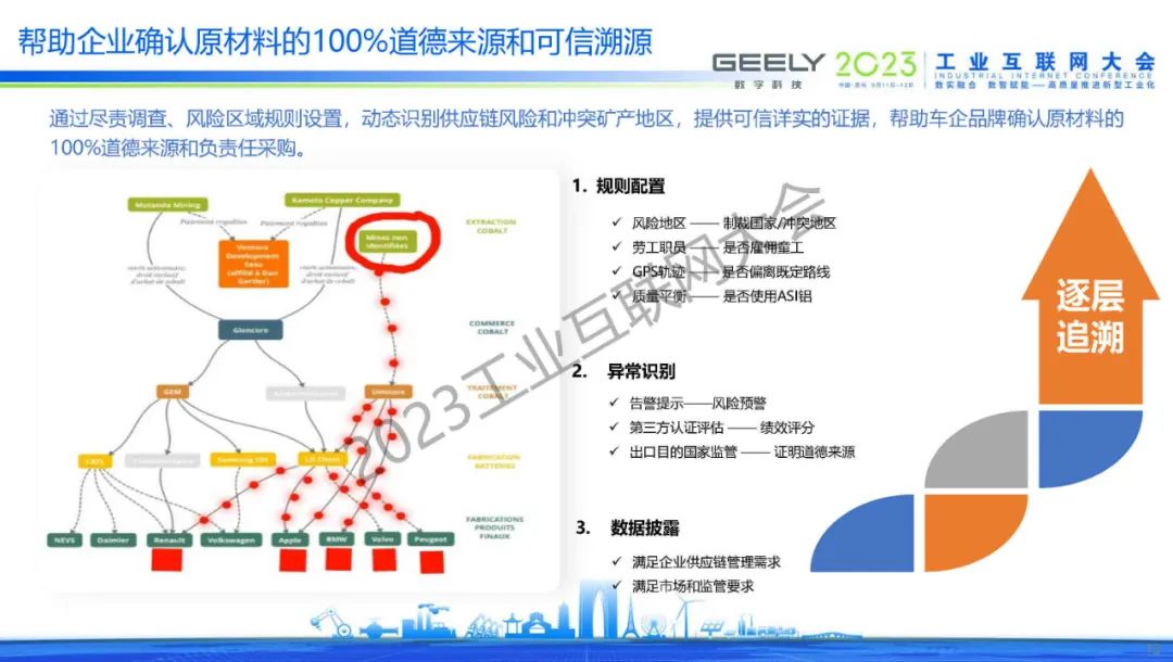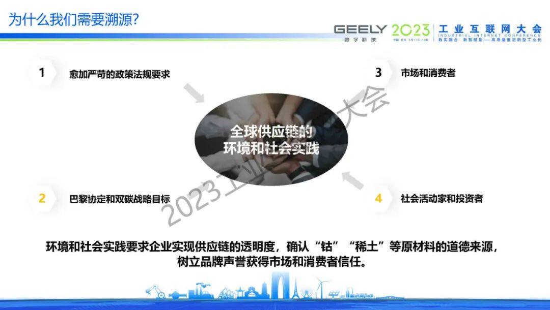 賽磊表示,環(huán)境和社會(huì)實(shí)踐要求企業(yè)實(shí)現(xiàn)供應(yīng)鏈的透明度,確認(rèn)“鈷”“稀土”等原材料的道德來源,樹立品牌聲譽(yù)獲得市場(chǎng)和消費(fèi)者信任。面對(duì)于復(fù)雜供應(yīng)鏈,數(shù)字化追溯是剛需。溯源的兩個(gè)重要組成部分,首先供應(yīng)鏈透明度和可見性,其次數(shù)據(jù)信息披露、滿足監(jiān)管合規(guī)。